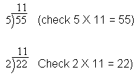 44 ÷ 2 = 22 (check 2 X 22 = 44)